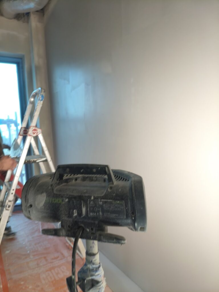 Po wyszlifowaniu powierzchnie są dokładnie odpylane i gruntowane natryskowo specjalistycznym gruntem który zabiela i przygotowuje pod malowanie. Szlifujemy szlifierkami Festool Planex z systemem orbitalnym i oświetleniem LED — LED przy szlifowaniu to jedyny sposób żeby zobaczyć każdą nierówność zanim ją zamalujemy.