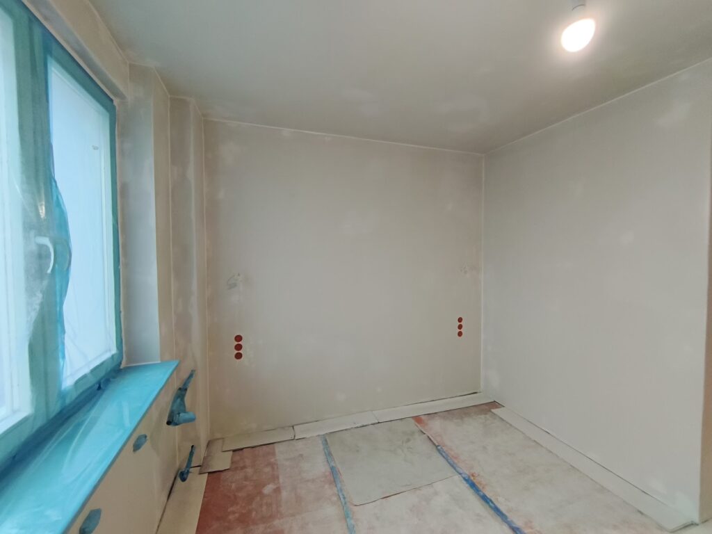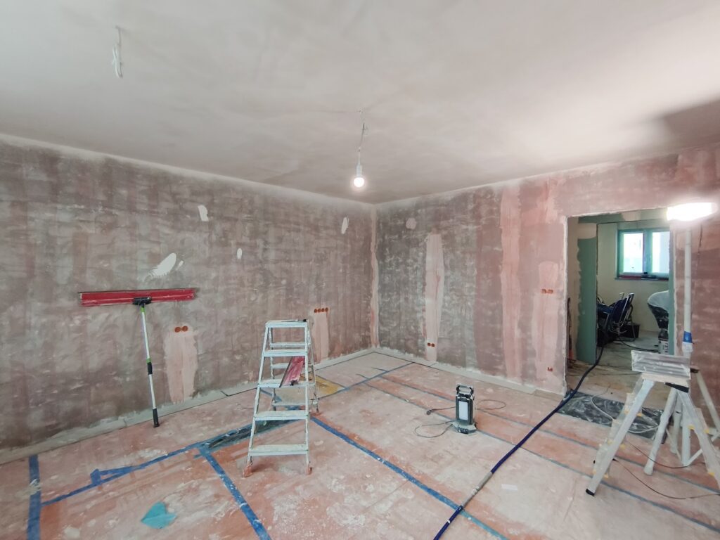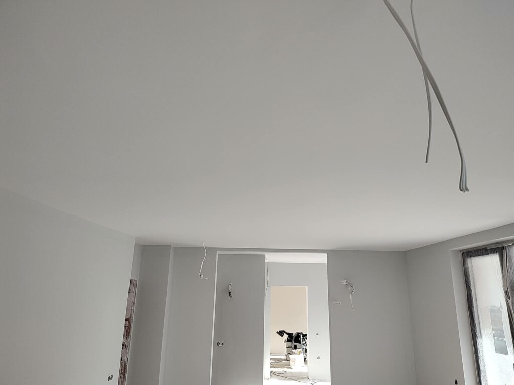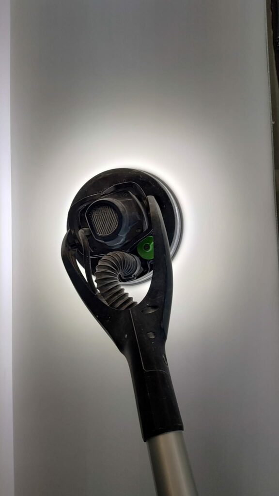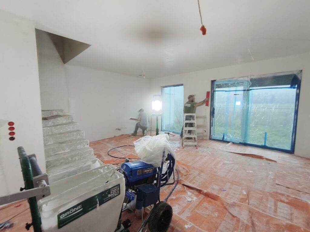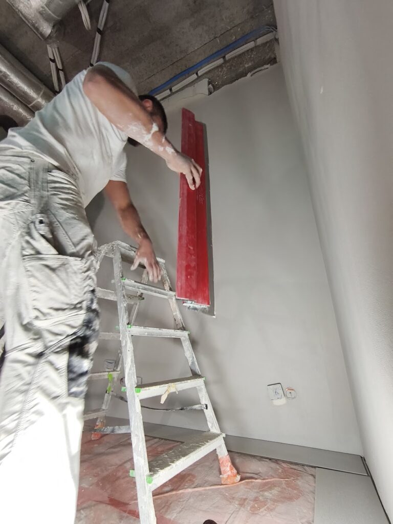 Zabezpieczenie folią, szlifowanie tynków, gruntowanie natryskowe, nakładanie gładzi maszynowe — masa wzmocniona polimerami. Szlifowanie Festool Planex 2 z odsysaniem pyłu. Ponowne gruntowanie, akrylowanie i montaż narożników aluminiowych.