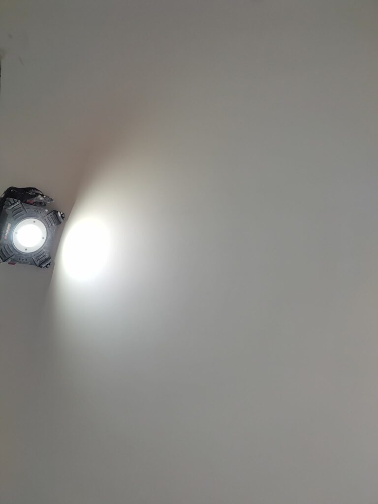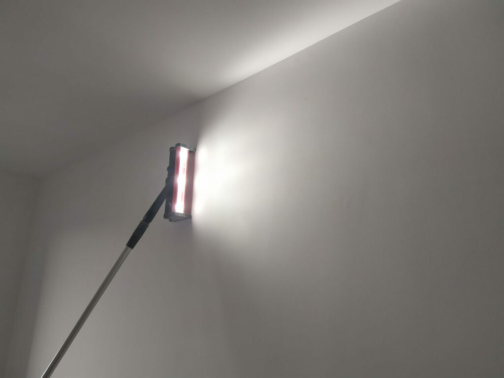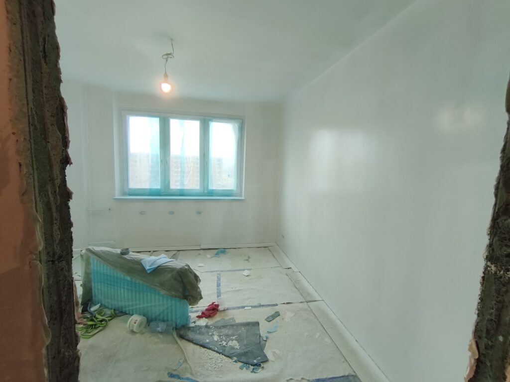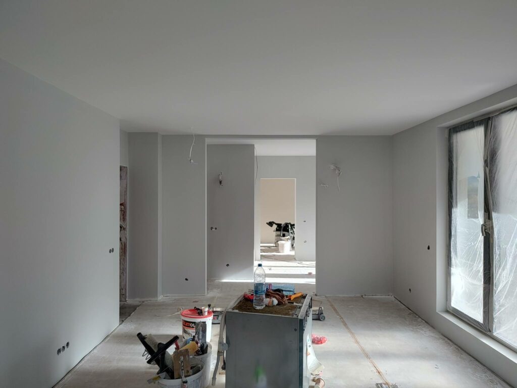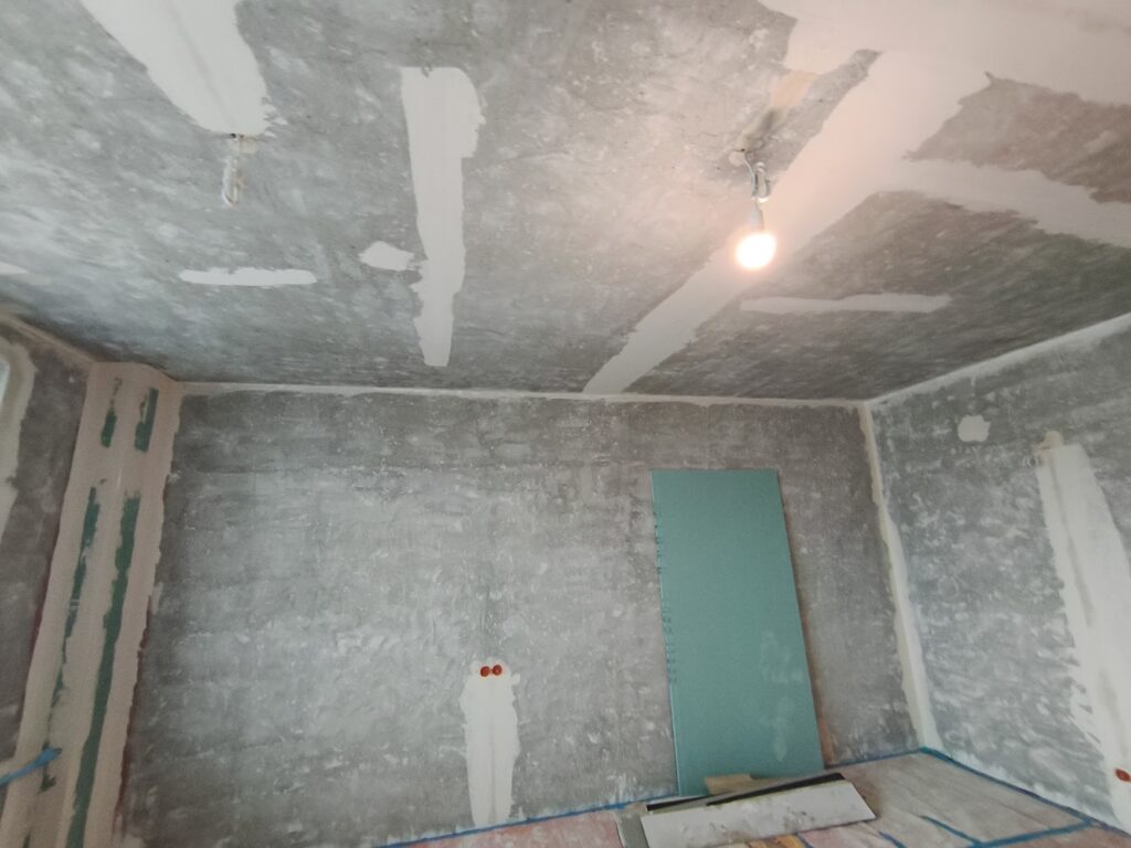 Zabezpieczenie folią, szlifowanie tynków, gruntowanie natryskowe, nakładanie gładzi maszynowe — masa wzmocniona polimerami. Szlifowanie Festool Planex 2 z odsysaniem pyłu. Ponowne gruntowanie, akrylowanie i montaż narożników aluminiowych.