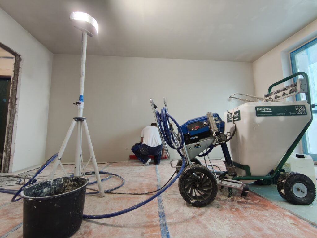 Szpachlowanie ścian i gładzie gipsowe metodą natryskową — realizujemy w Pniewach i okolicach. Agregatem Graco, szlifowanie Festool Planex 2 z odsysaniem pyłu. Ten sam standard co w Poznaniu, bez dopłat za dojazd.